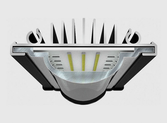 Perfil em alumínio com aletas de refrigeração e lente óptica