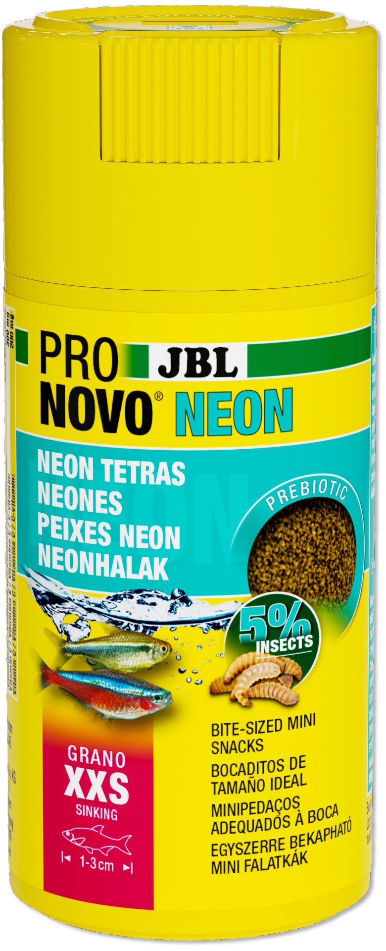 O JBL PRONOVO NEON GRANO é produzido com matérias-primas naturais e sem aditivos artificiais fornecendo uma alimentação mais próxima da encontrada pelos peixes na natureza. Testado em caracídeos no seu habitat natural durante as expedições de pesquisa da JBL na América do Sul.