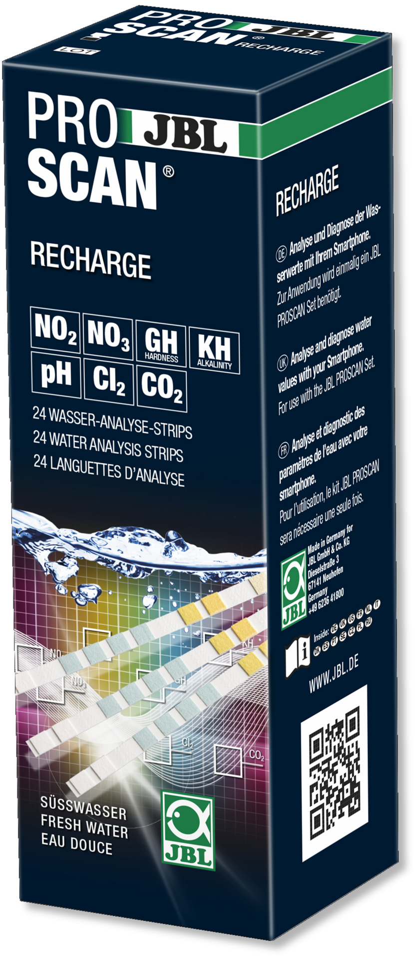 ProScan Recharge. Conteúdo: 24 fitas de análise de água. Necessita ter a paleta de cores JBL Proscan (fornecida apenas com o Kit completo JBL PROSCAN) e a app JBL Proscan para Android ou iPhone.