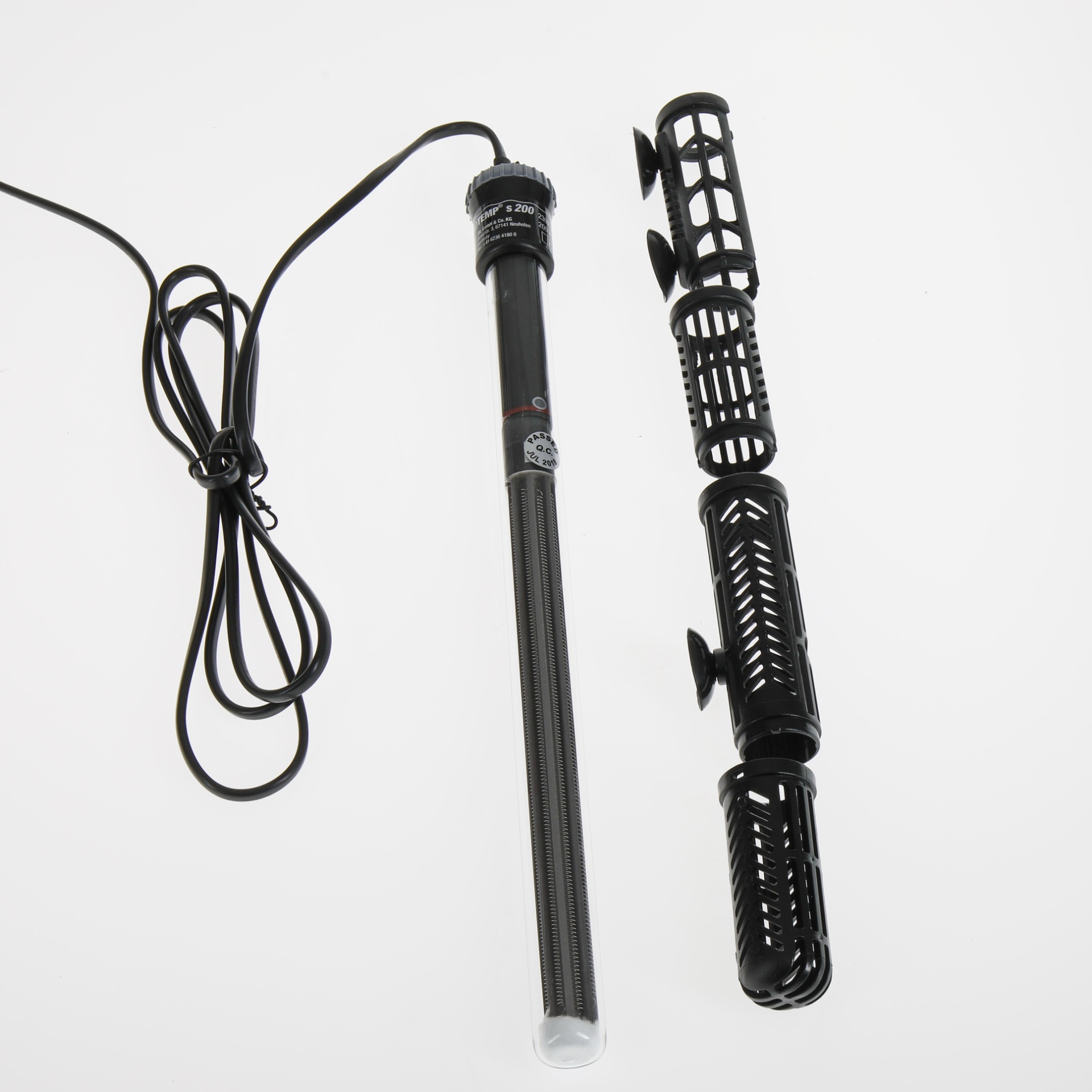 Instalação simples: introdução do aquecedor no cesto de proteção, seleção da temperatura com o botão giratório, introdução no aquário, fixação com suportes de ventosa no vidro do aquário interior.