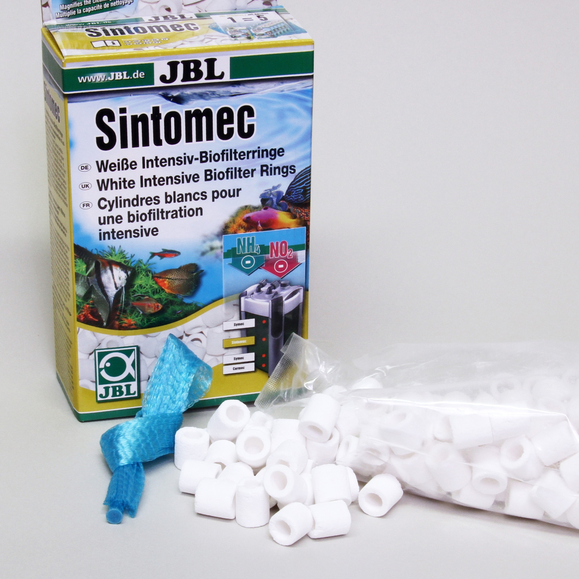 Incluído: 450 g de anéis de vidro branco para filtragem biológica e saqueta de rede para enchimento