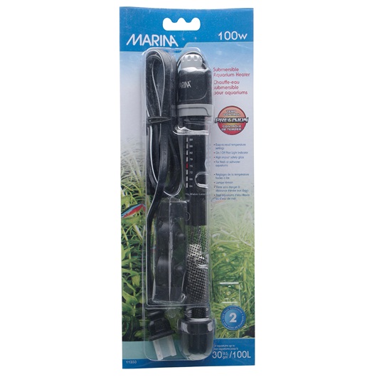 O aquecedor para aquário Marina 100W é robusto e submersível, fornecendo aquecimento confiável para aquários de água doce ou salgada.