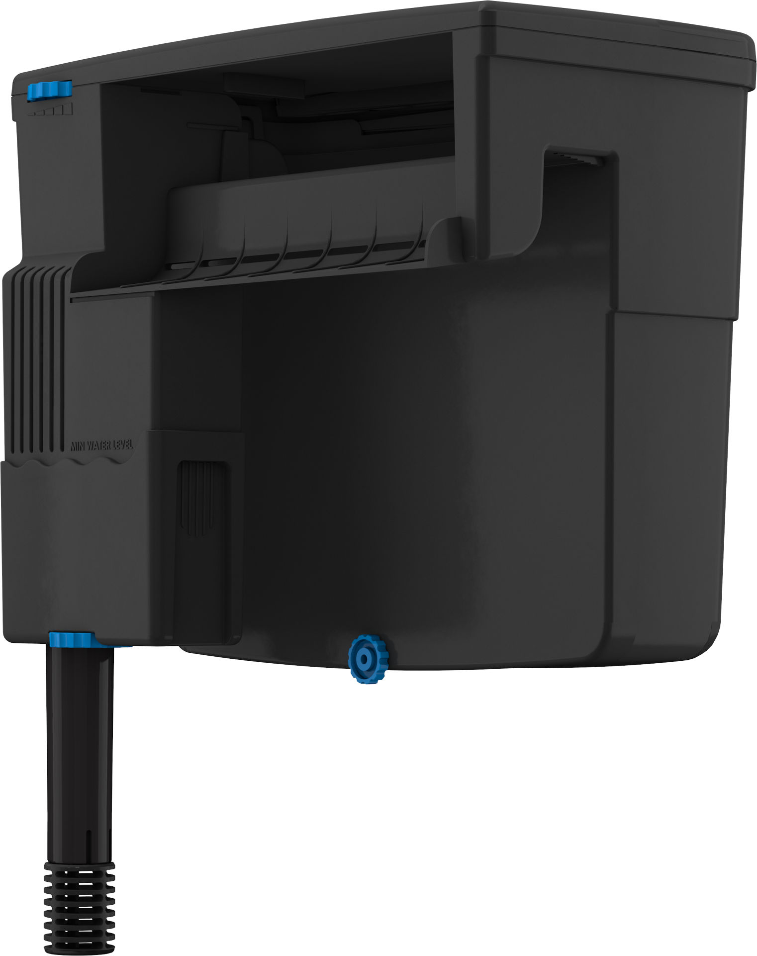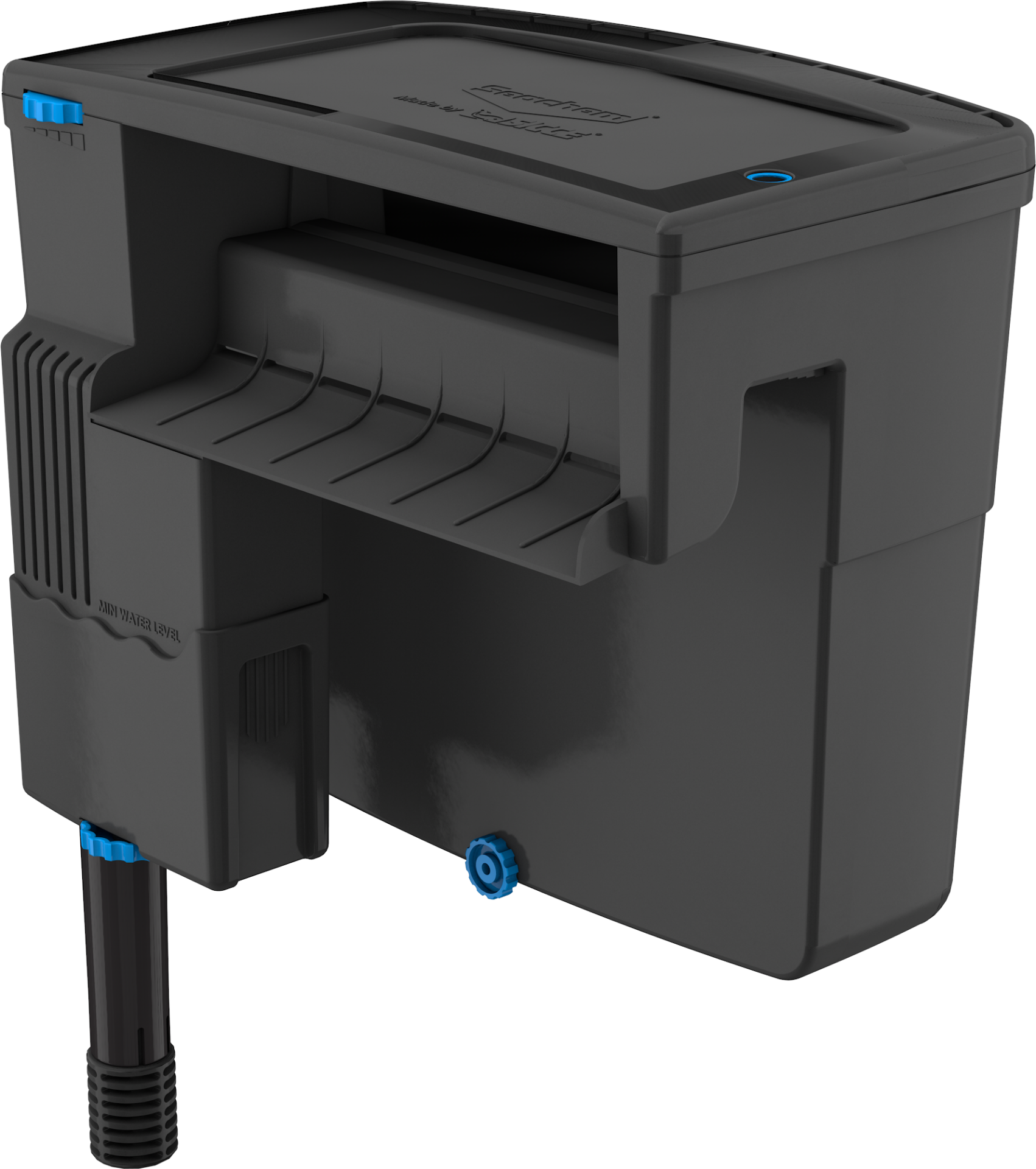 A bomba impulsiona a água para o interior do cesto do filtro a partir da parte inferior, saindo pela parte superior. O fluxo de baixo para cima garante que a água entra em contacto com todos os meios filtrantes, sem contornar ou passar por cima, como acontece com outros filtros externos de cascata, que têm fluxo de trás para a frente.