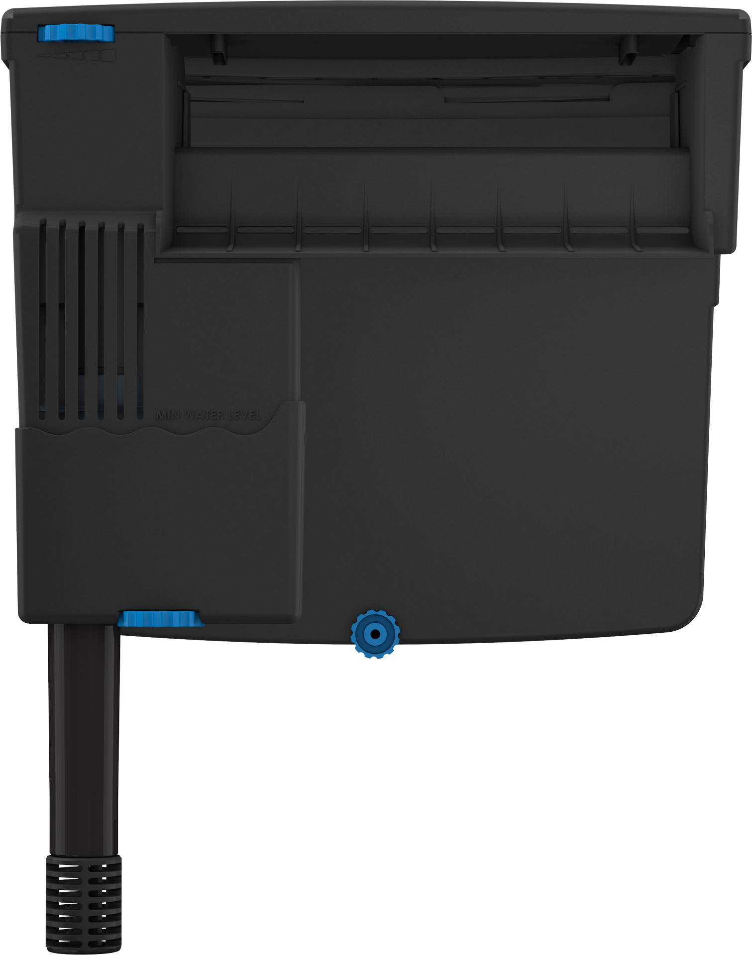 As ranhuras de ventilação na tampa do filtro e os sulcos de arejamento na saída do fluxo maximizam as trocas gasosas durante a filtragem e garantem que a água devolvida ao aquário está totalmente oxigenada.