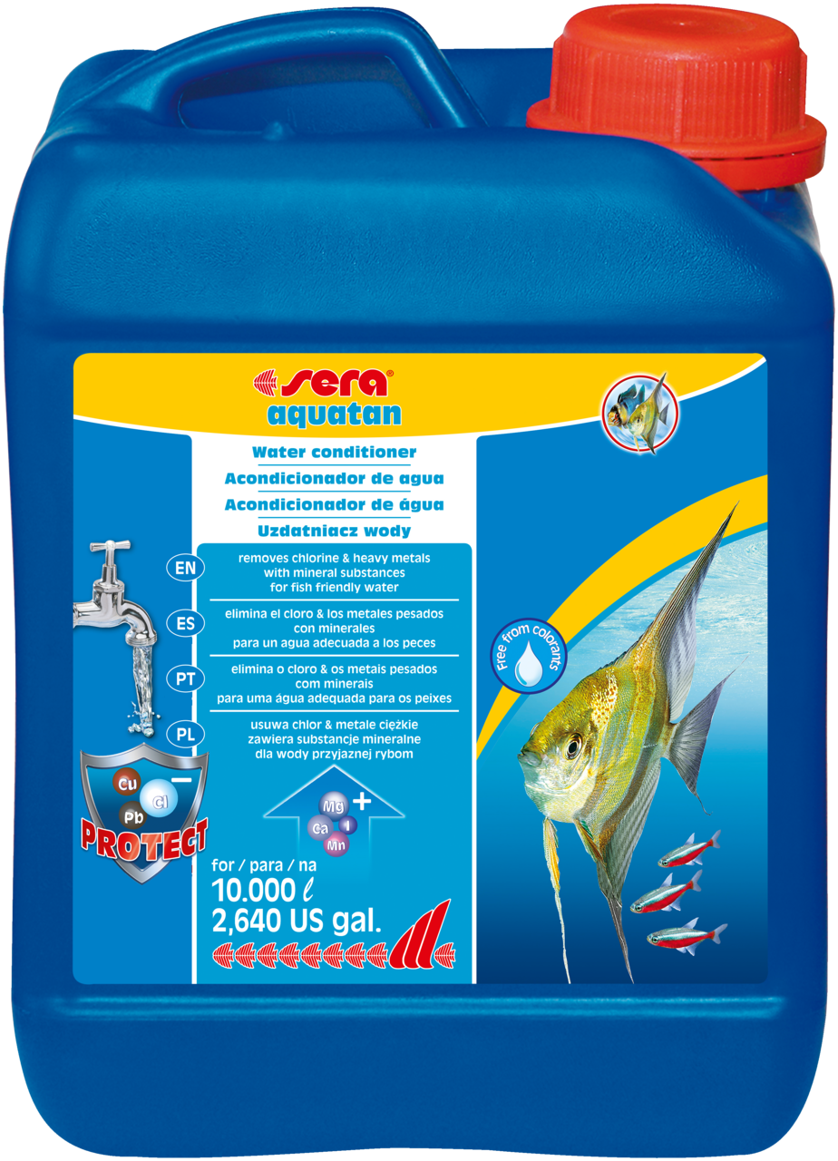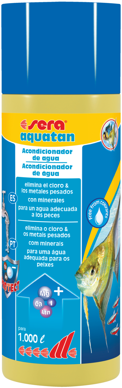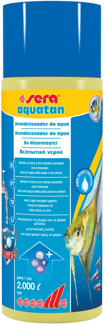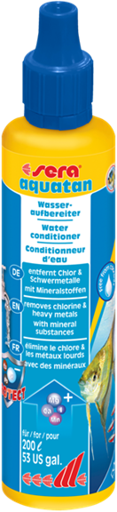 O Sera aquatan acondiciona a água da torneira, transfomando-a imediatamente em água adequada e saudável para os peixes. Elimina tóxicos como cloro e as cloraminas, aglutina os metais pesados (p. ex. cobre, zinco ou chumbo) e protege contra a amónia.
