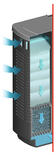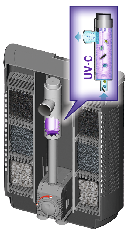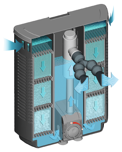 Os 6 cestos aplicados no filtro permitem a colocação fácil e a substituição rápida dos materiais filtrantes e podem-se retirar por cima, por meio de placas de suporte extraíveis. A água, que é purificada biologicamente e, ao mesmo tempo, sujeita a radiação UV-C, volta para o aquário através de um distribuidor flexível. Os bicos planos para a saída de água garantem melhor circulação no aquário.