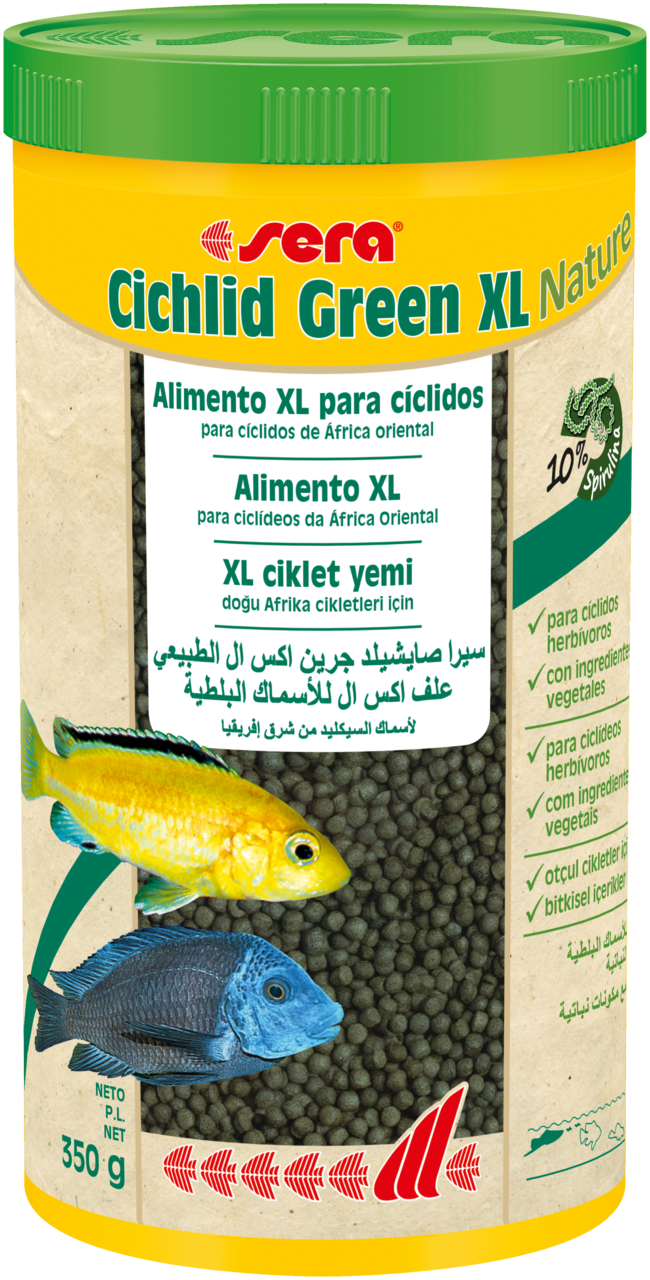 O Sera Cichlid Green XL Nature é um alimento base completo, sem corantes nem conservantes, composto por granulado cuidadosamente processado. É especialmente adequado para grandes ciclídeos, principalmente herbívoros e comedores de algas e outros peixes de grande tamanho.