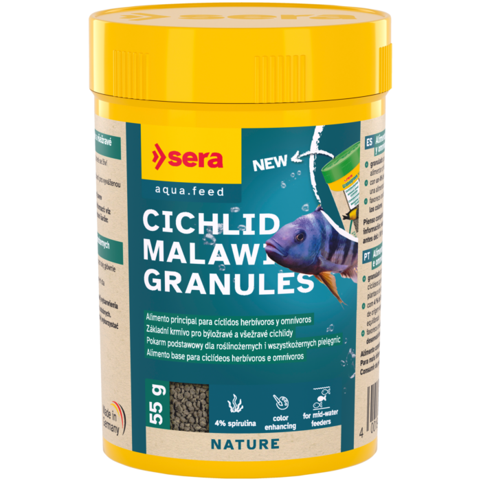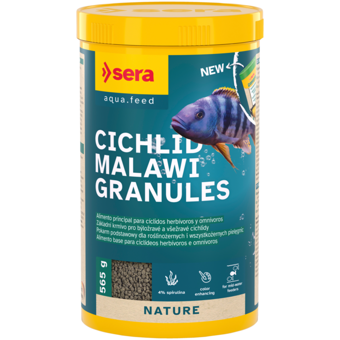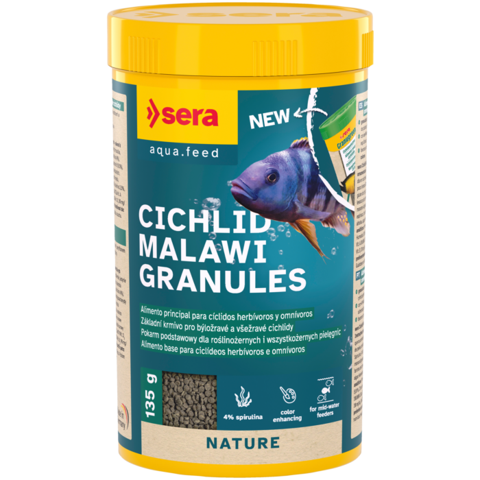 O Sera Cichlid Malawi Granules é um alimento completo para ciclídeos herbívoros e omnívoros, especialmente os com origem na África Oriental e no lago Malawi.