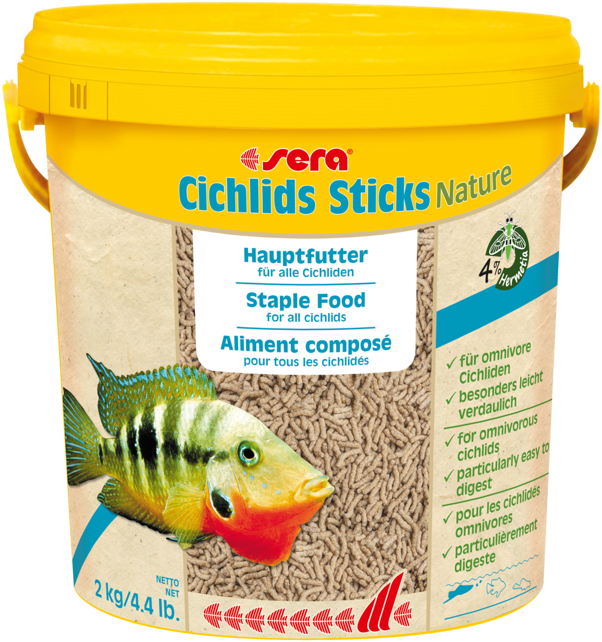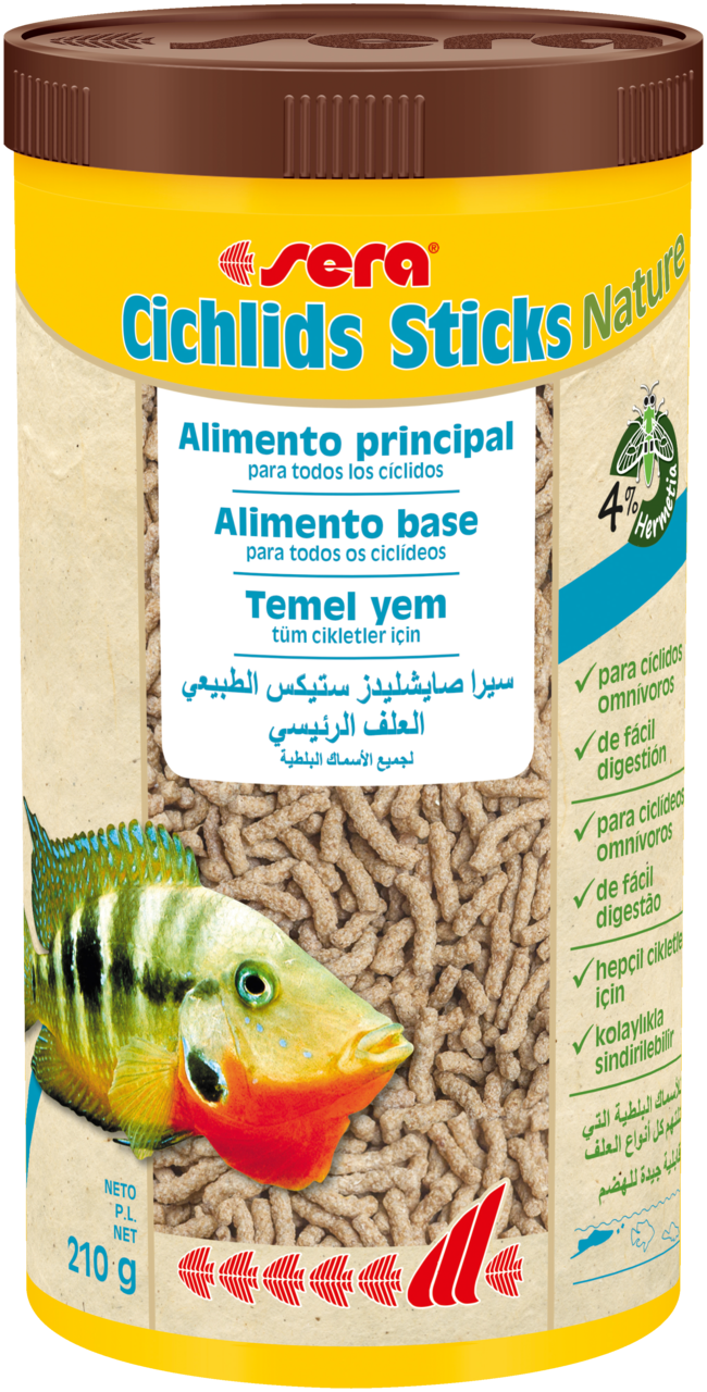 sera Cichlids Sticks Nature é um alimento completo, sem corantes nem conservantes, em forma de sticks cuidadosamente processados, para ciclídeos omnívoros de tamanho médio e grande, incluindo muitas espécies africanas e da América do Sul.