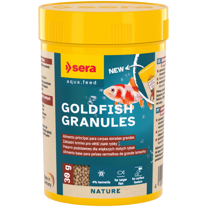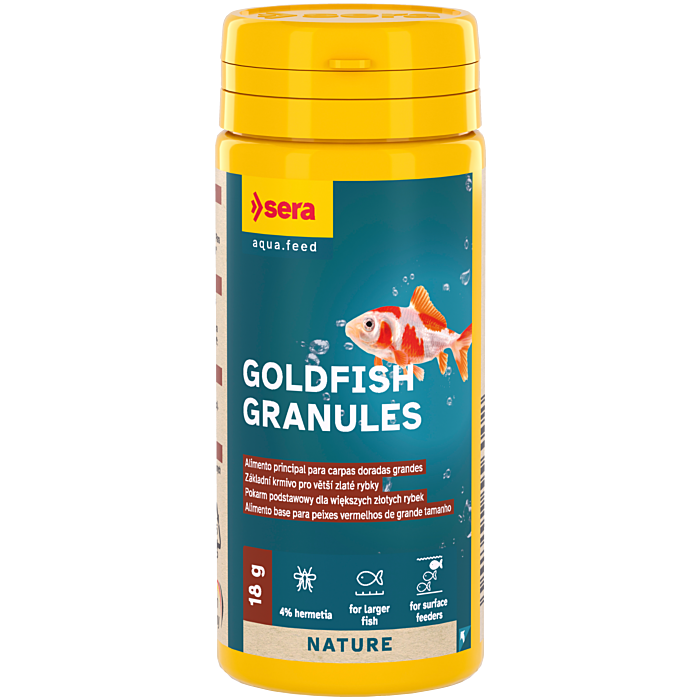 Sera Goldfish Granules (antigo Goldy Gran Nature) é um alimento em forma de granulado flutuante para peixes vermelhos e variedades de peixes vermelhos mais sensíveis (ex. Orandas, caudas de véu).