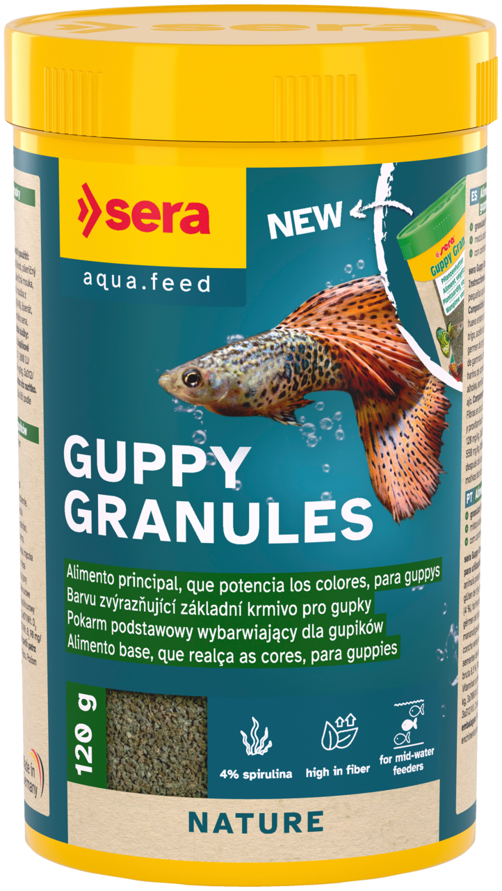 O Sera Guppy Granules é um alimento base de fácil digestão, para guppies e outros peciliídeos.