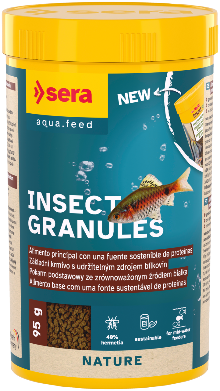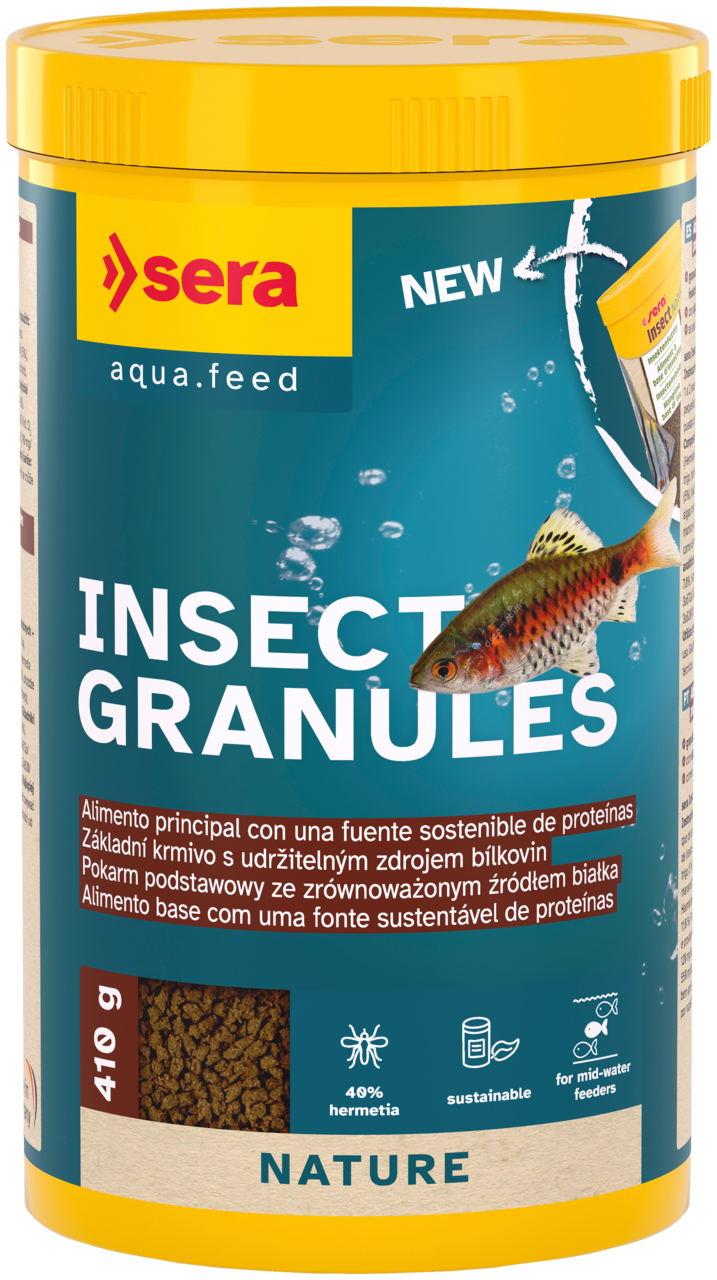 O Sera Insect Granules é um alimento completo, com uma elevada proporção de farinha de insetos obtida de forma sustentável, sem corantes nem conservantes.