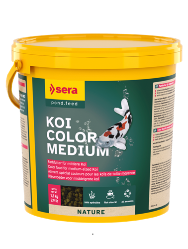 O Sera Koi Color Medium é um alimento completo, potenciador da cor, ideal para carpas koi de tamanho médio. A sua composição rica em spirulina, gammarus e krill, contém um teor ideal de carotenoides, oligoelementos, ácidos gordos ómega e proteínas facilmente assimiláveis que promovem uma coloração ótima das Kois.