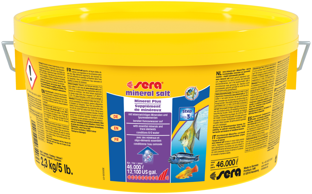 Visto que o sera mineral salt não altera a dureza de carbonatos (aumenta só a dureza total, não a dureza de carbonatos), também se pode aplicar, sem problemas, em aquários de água macia (p. ex. aquários com peixes-disco), também como proteção contra a “doença do buraco”.