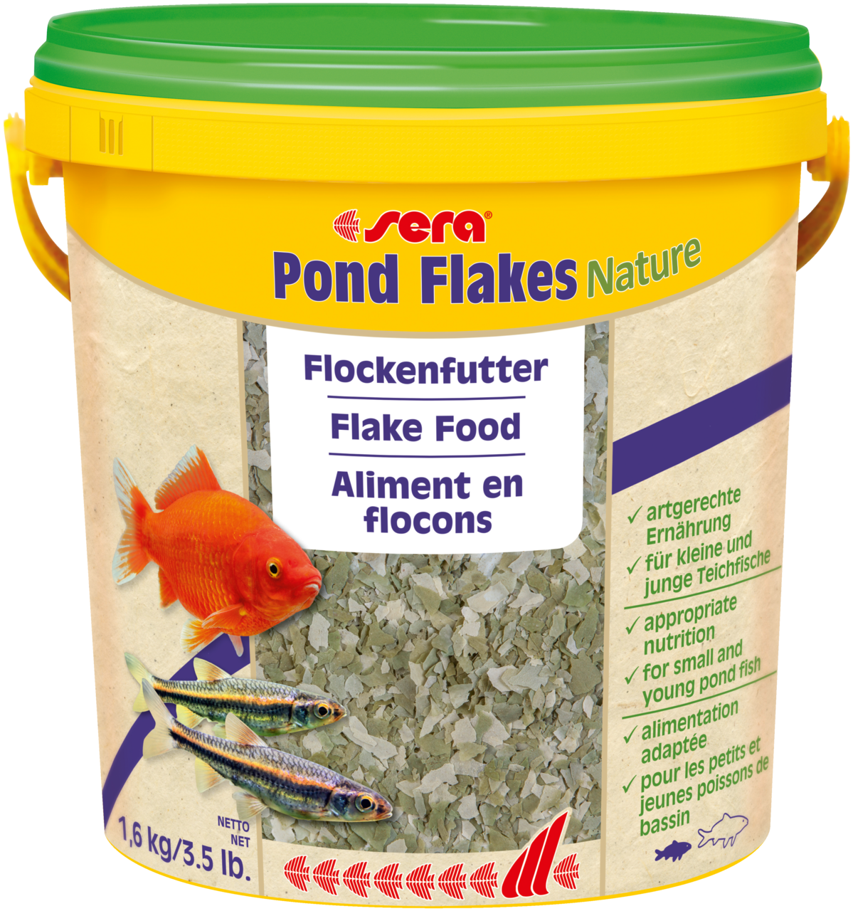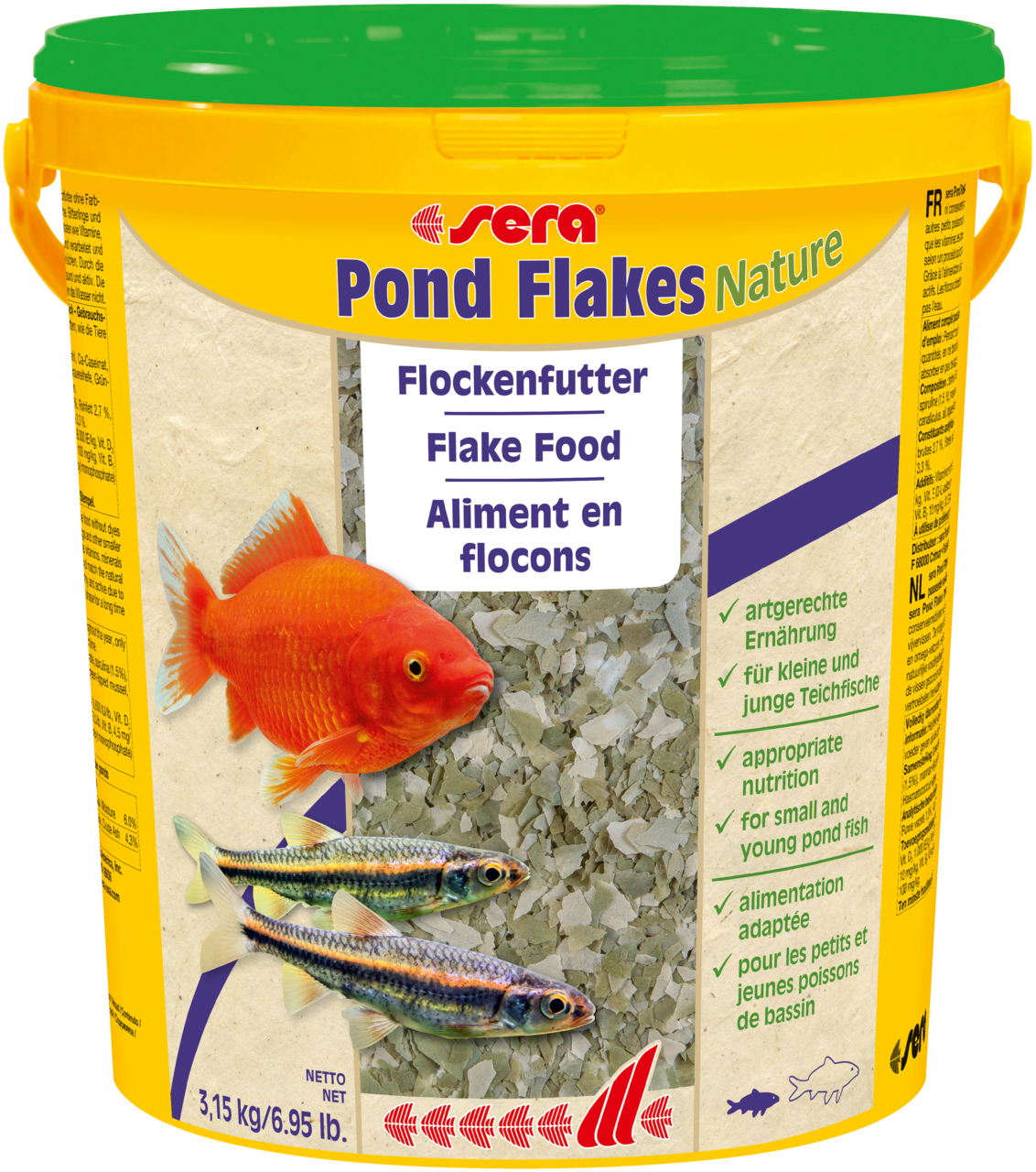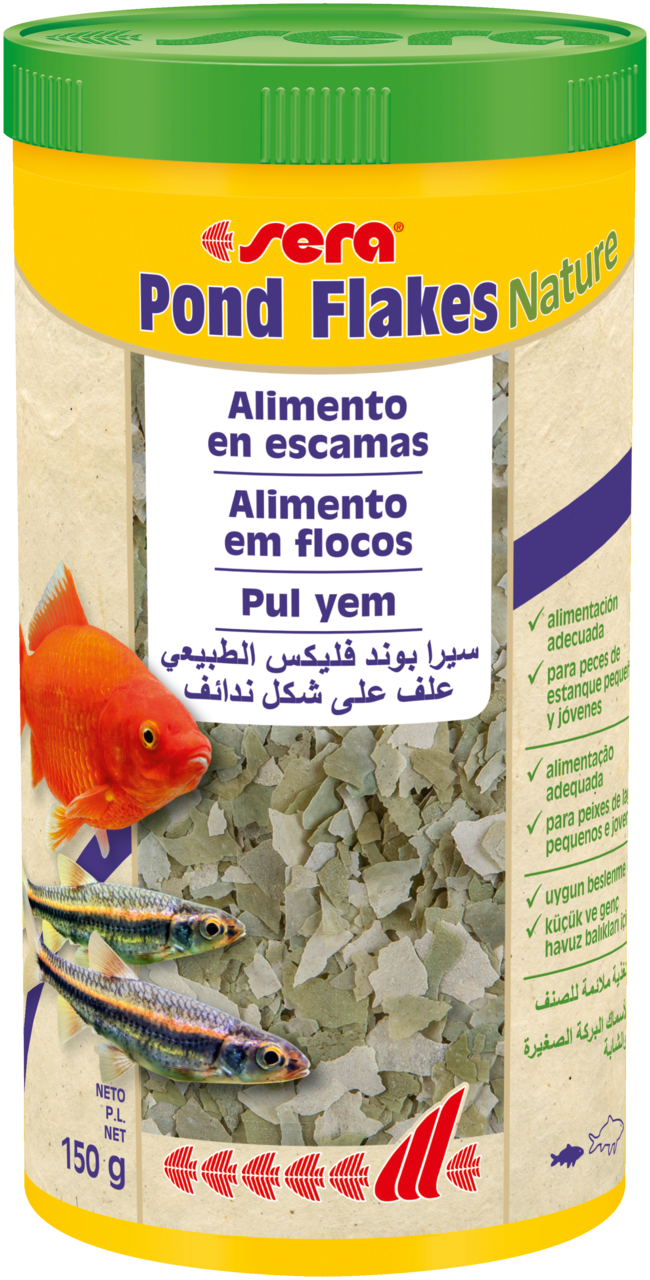 Sera Pond Flakes Nature é o alimento base composto por flocos cuidadosamente processados, sem corantes nem conservantes, para todos os peixes de lago de pequeno tamanho, tais como peixes vermelhos e carpas peixes jovens.