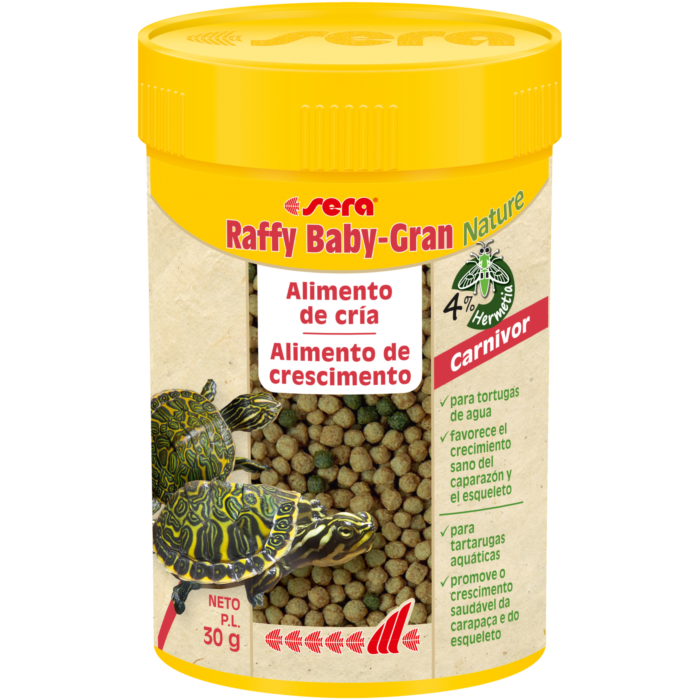 O Sera Raffy Baby-Gran Nature é um alimento base de crescimento, sem corantes nem conservantes, composto por gânulos cuidadosamente processado, para répteis carnívoros jovens, tais como tartarugas aquáticas pequenas.