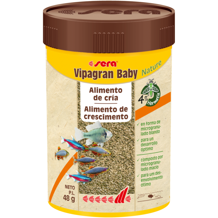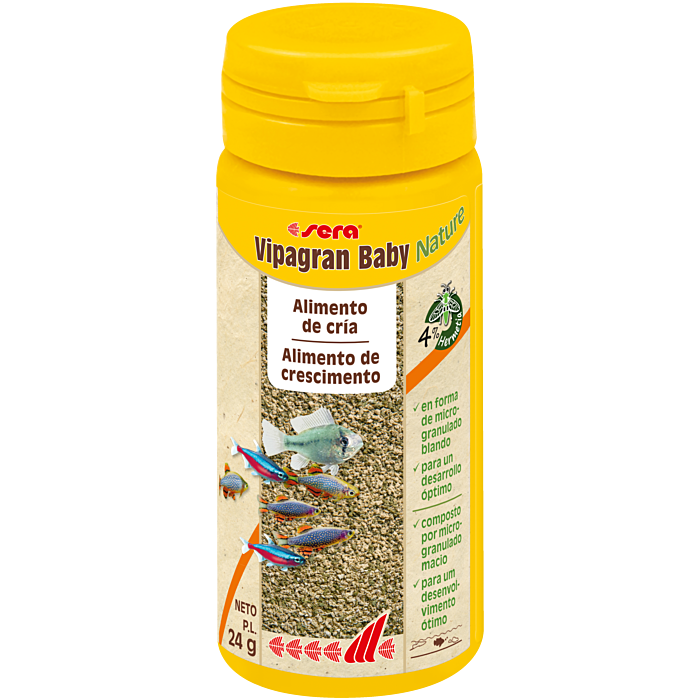 Sera Vipagran Baby Nature é um alimento especial de crescimento com 4 % de farinha de insetos, em forma de microgranulado macio, especialmente indicado para alevins e peixes jovens.