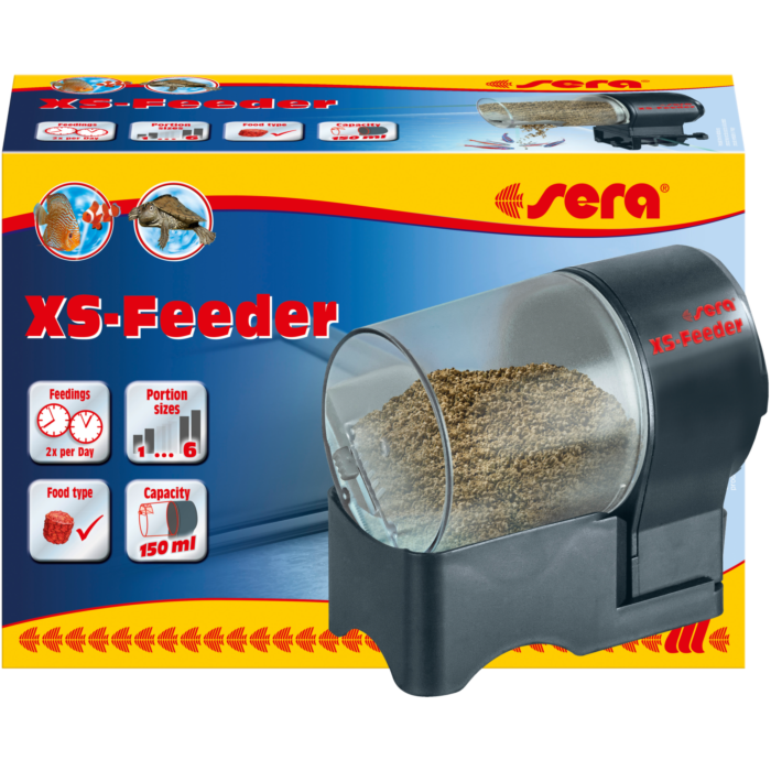 O alimentador automático Sera XS-Feeder está equipado com um reservatório de 150 ml e foi concebido para dispensar alimentos em flocos, granulados e pastilhas de diferentes tamanhos.