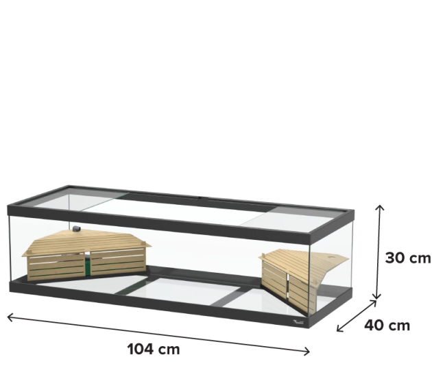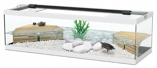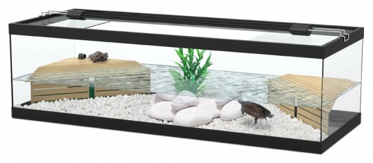 Aquários para tartarugas, fabricados em vidro e desenhados a pensar no bem-estar destes animais, com rampa e plataforma de descanso.